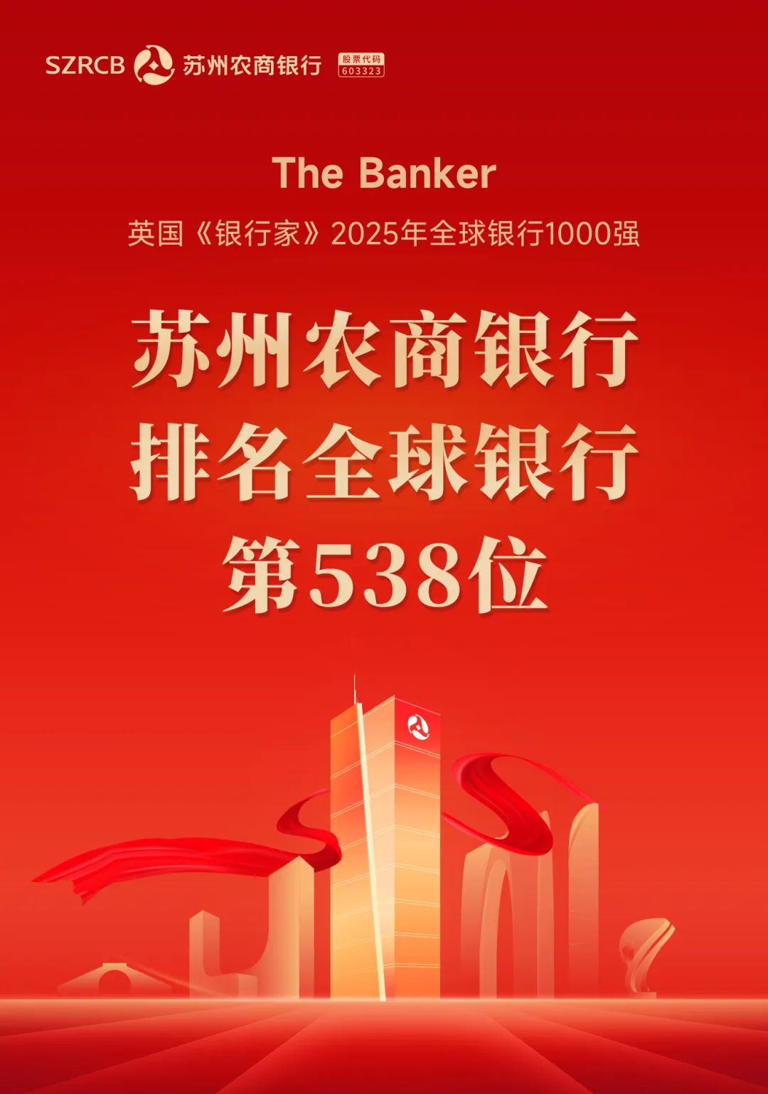 7月2日,英国《银行家》(The Banker)杂志公布了“2025年全球银行1000强”(TOP 1000 WORLD BANKS)榜单,苏州农商银行全球排名第538位,较2024年上升20位。
